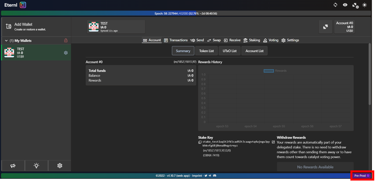 Once your pre production wallet has been created it will display "Pre-Pod" in the bottom right-hand corner