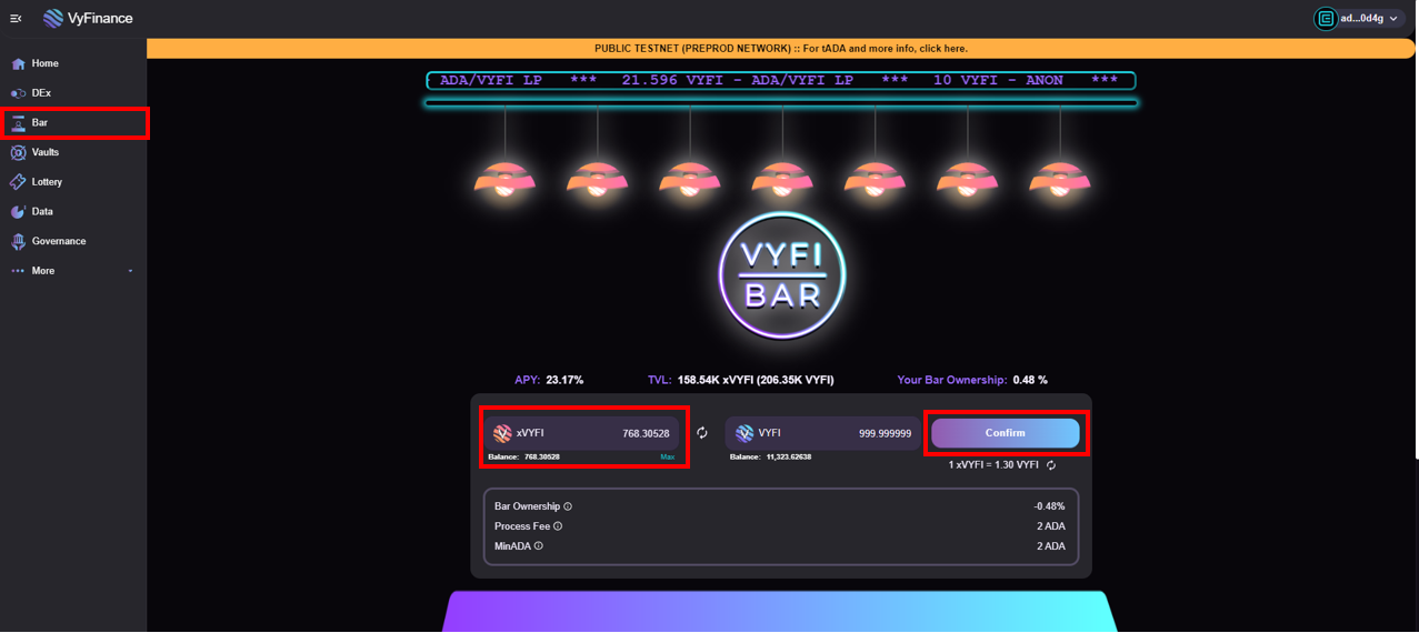 To withdraw your $VYFI from the BAR you will need to swap your xVYFI for $VYFI