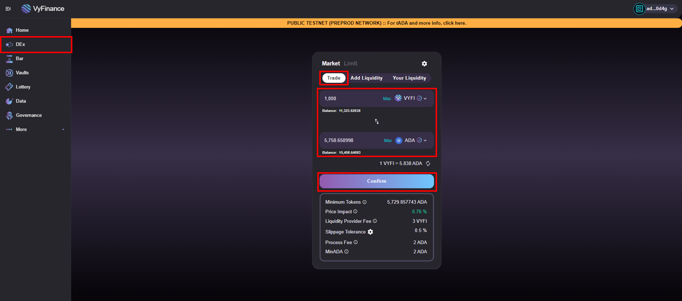 Locate the "DEx" tab on the VyFinance App