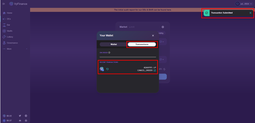 *On order txs are either yet to be processed or are out of bounds due to your set slippage.*
